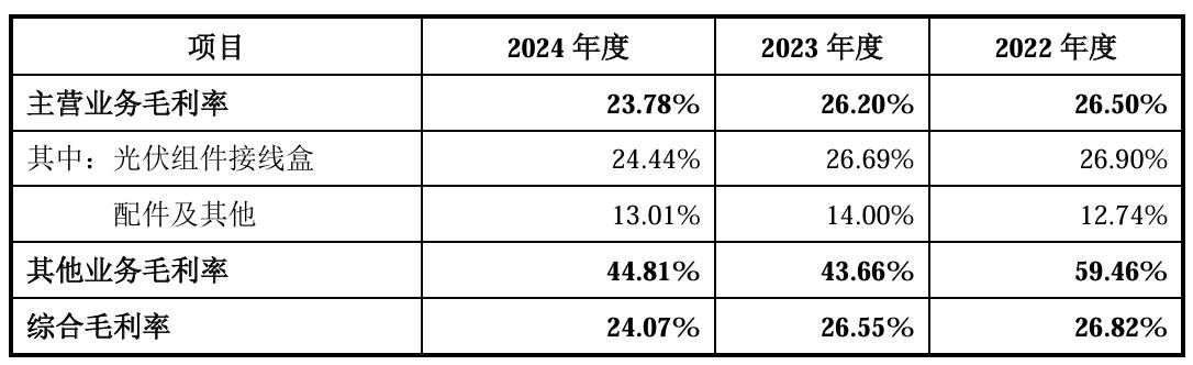 正因如此,毛利率水平的合理性成為了深交所兩度問詢的重點。澤潤新能解釋稱,2023年以來國內光伏行業競爭加劇,下游客戶存在將部分優化成本的競爭壓力傳導至光伏組件接線盒行業的情況,導致其相關產品價格和毛利率有所下降。