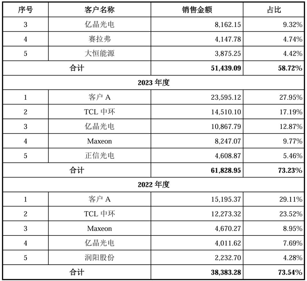 但在通過客戶合作的方式保證業績增長的同時,澤潤新能客戶相對集中的問題也逐漸凸顯。由于該公司下游頭部光伏組件廠商的主導地位有所加強,報告期內其來自前五大客戶的銷售收入分別占總收入的73.54%、73.23%和58.72%。