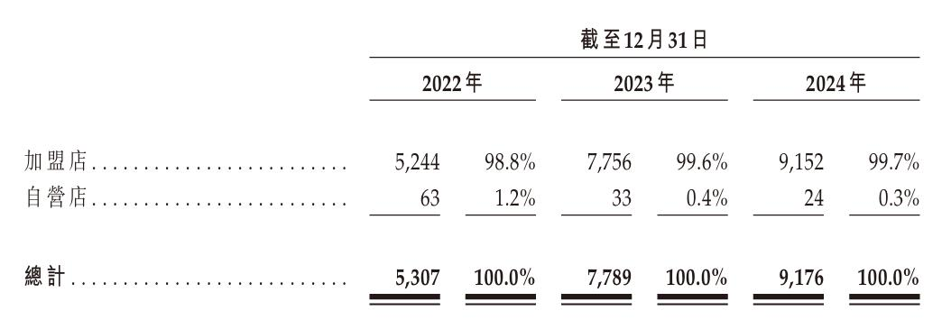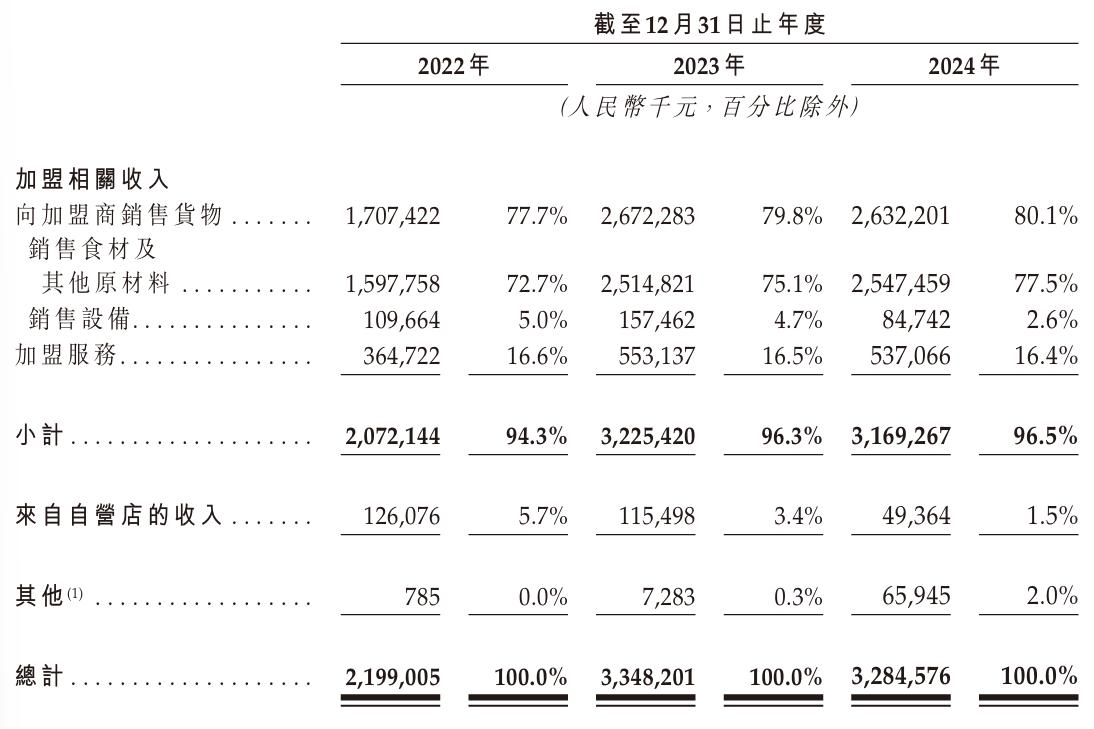 值得注意的是,滬上阿姨全國范圍內的門店中僅有24家為自營門店,剩余的9152家均由加盟商經營,占比高達99.7%,其收入也絕大部分來自向加盟商銷售食材、包裝及其他原材料等貨物,以及提供加盟服務。