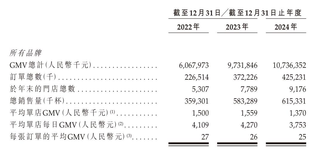 2024年,滬上阿姨的總GMV雖然同比增長10.3%至107.36億元,但其旗下所有品牌的單店平均GMV卻出現了12.1%的同比下滑,來到137萬元,單店日均GMV也由2023年的4270元降低12.1%至3753元。