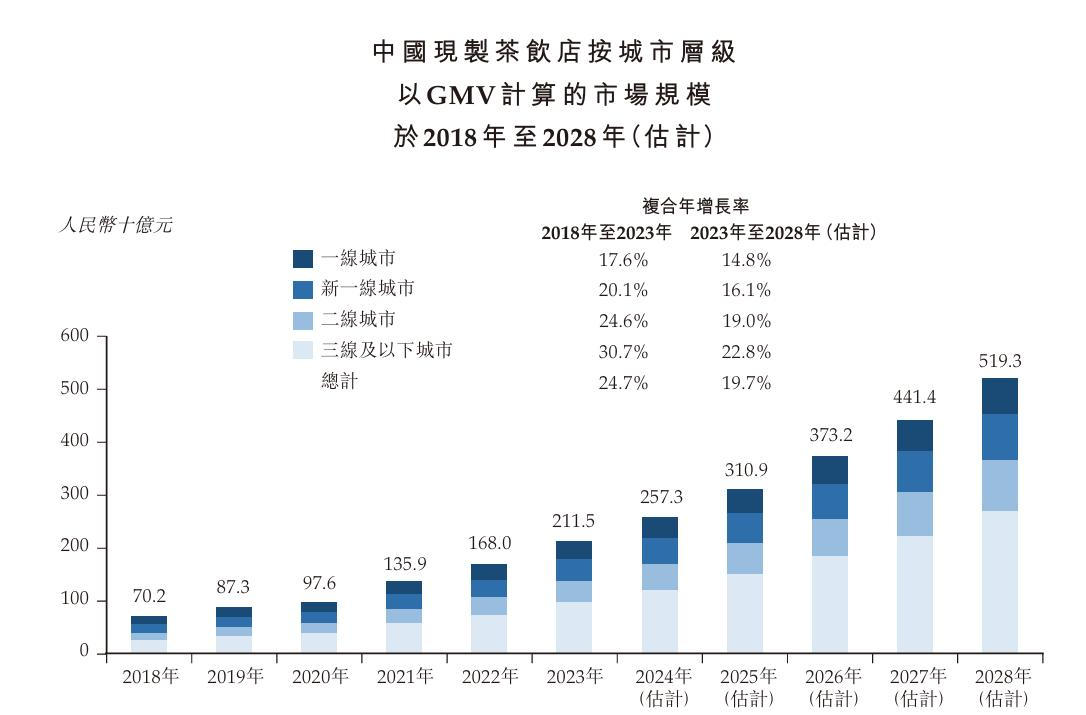灼識咨詢資料顯示,雖然2024年中國現制茶飲店行業及現磨咖啡市場增速有所放緩,但國民對個性化及多元化消費的需求穩步上升。其中,三線及以下城市人口多、消費需求大,2023年的GMV約占中國現制茶飲店市場的45.4%。