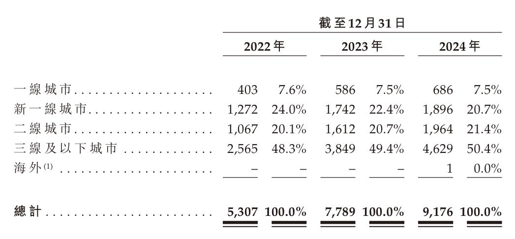 截至2024年末,滬上阿姨共擁有9176家門店,門店網絡覆蓋中國全部4個直轄市、5個自治區及22個省份的300多個城市。根據灼識咨詢報告,截至2023年末,滬上阿姨是覆蓋城市最多的中國中價現制茶飲店品牌。