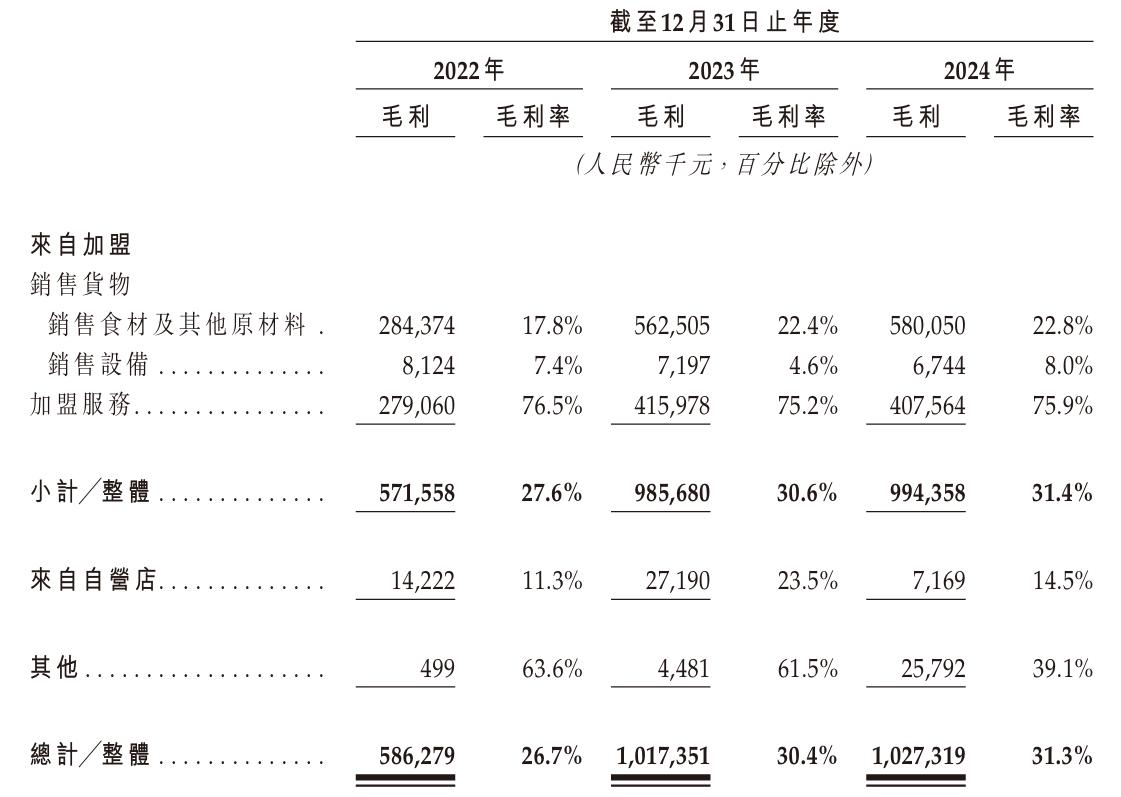 滬上阿姨在招股書中強調,雖然外部競爭壓力導致其客單價、門店銷售額略有下滑,但在其成本控制措施下,該公司2024年的毛利率逆勢提升0.9個百分點至31.3%,歸母凈利潤也同比增長至4.18億元。