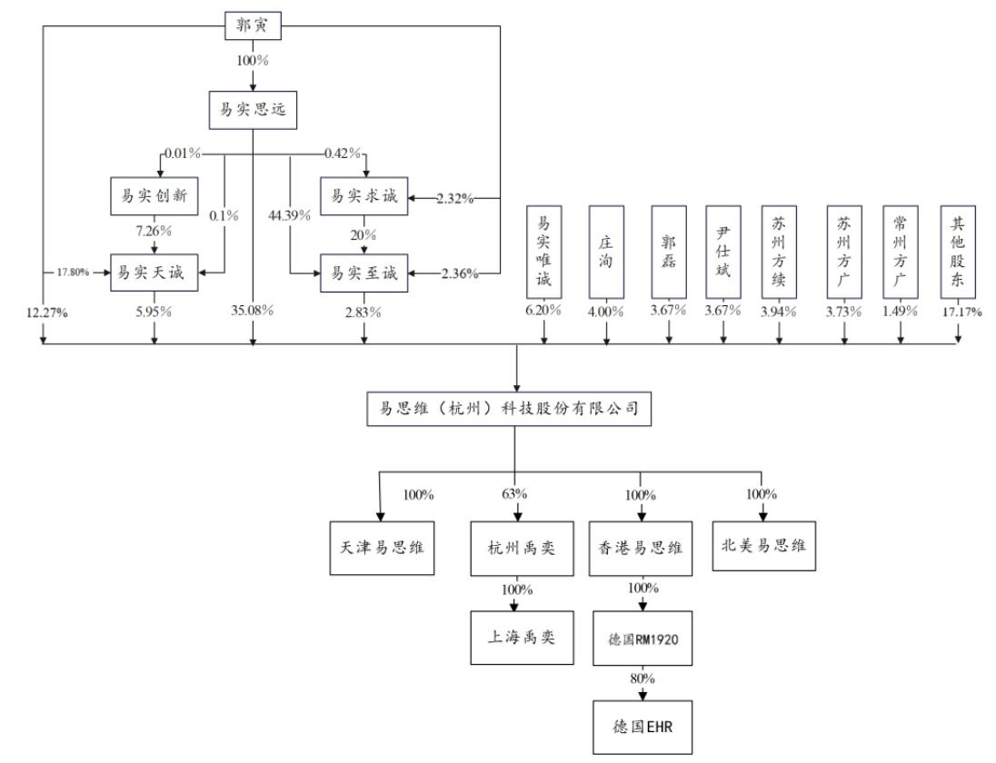 據招股書披露,易實思遠為易思維的控股股東,持股35.08%。其中,郭寅持有易實思遠100%的股權。同時,郭寅還直接持有易思維12.27%的股權,并通過易實天誠、易實至誠分別間接控制該公司5.95%、2.83%的股份,合計控制該公司56.13%的股份。