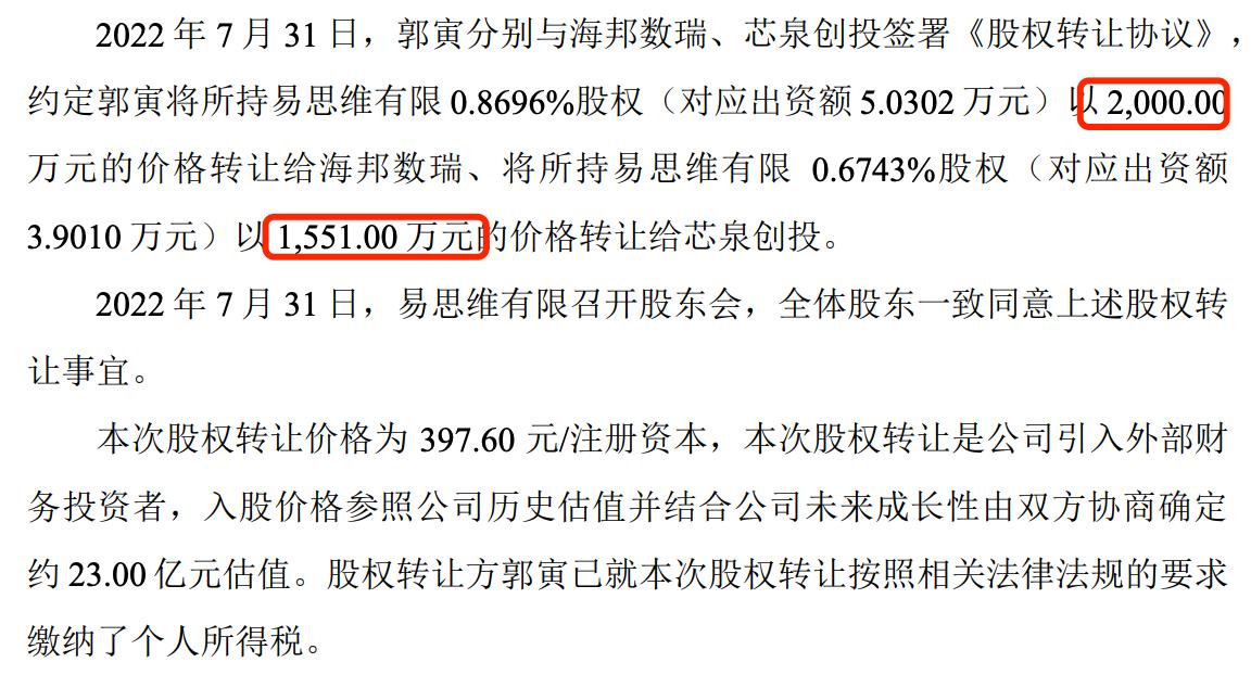 事實上,這并非郭寅第一次對外轉讓所持易思維的股權。據招股書披露,2022年6月,郭寅就向盛際福源轉讓該公司0.7056%股權,作價1270萬元。同年9月,郭寅亦向海邦數瑞、芯泉創投分別轉讓0.8696%、0.6743%股權,分別作價2000萬元、1551萬元。