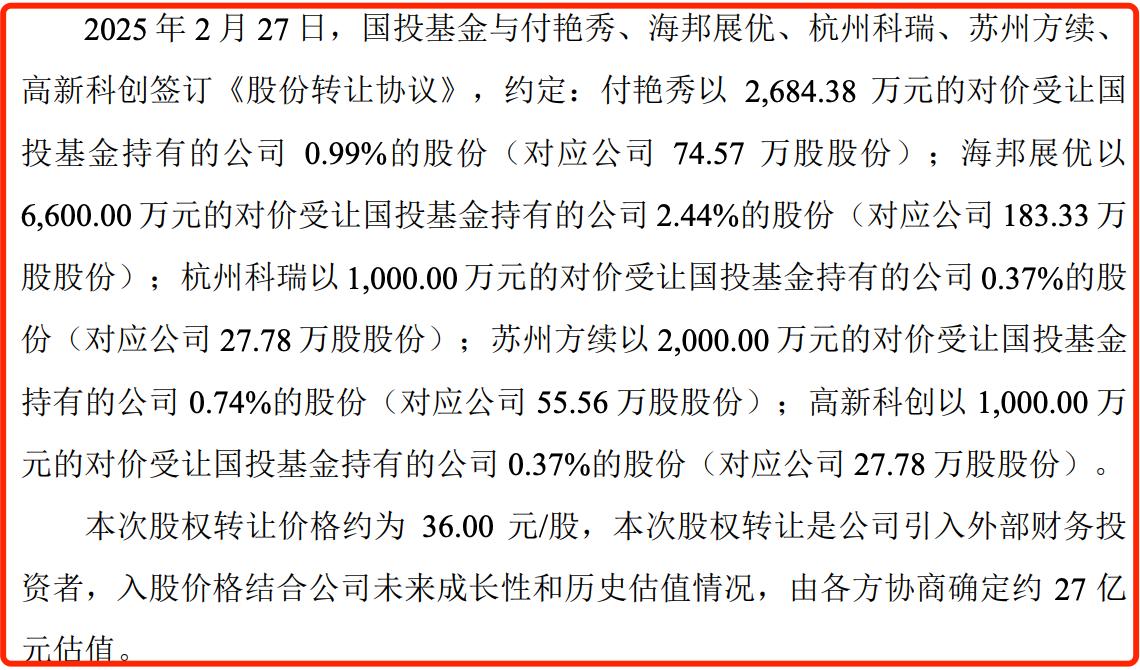 受讓完成后,國投基金不再是易思維的股東。另在2024年12月,安豐元港、安豐富盛還分別出資400萬元、600萬元分別向郭寅收購了易思維0.15%、0.22%的股權,對應易思維估值約27億元。