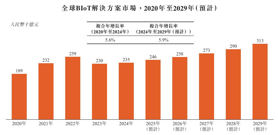 灼識咨詢的資料顯示,全球BIoT解決方案市場穩步增長,由2020年的約1890億元增長至2024年的約2350億元,復合年增長率約為5.6%;并預計繼續以5.9%的復合年增長率,進一步增至2029年的約3130億元。