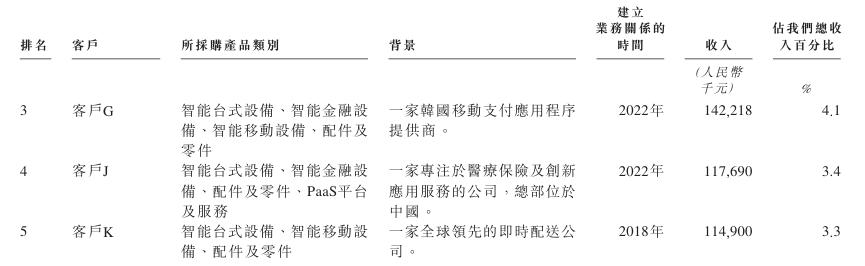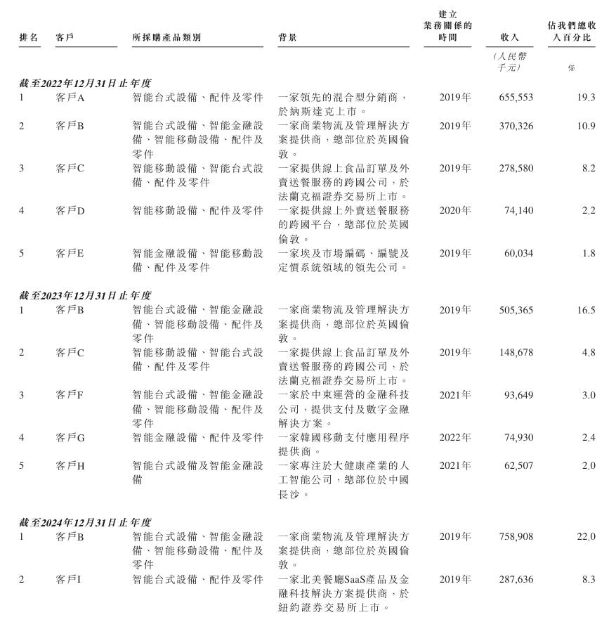 不難看出,商米科技的業務發展,很大程度上取決于其能否持續推出商業合作伙伴和商戶認可的全新或升級產品或服務。報告期內該公司來自前五大客戶的收入分別為14.39億元、8.85億元和14.21億元,占比42.3%、28.8%和41.1%。