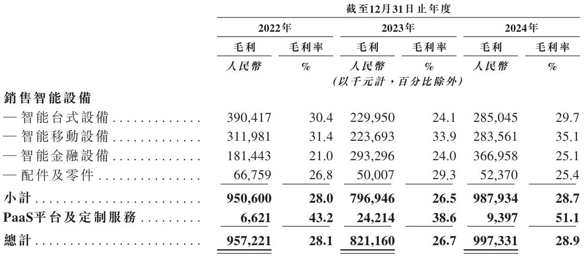 需要指出的是,智能移動設備恰恰是商米科技的高毛利板塊。但由于商米科技當年進行了產品迭代升級,導致智能移動設備所得收入占比有所降低,智能設備銷售的毛利率也減少了1.5個百分點至26.5%,最終影響了該公司的整體毛利水平。