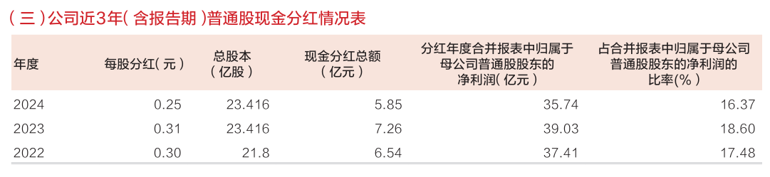 而東莞銀行逐年走低的分紅也讓其成功上市后的股價不容樂觀。2022年到2024年,該行每股分紅分別為0.3元/股,0.31元/股,0.25元/股,現金分紅總額分別為6.54億元,7.26億元,5.85億元,占歸母凈利潤比例分別為17.48%、18.60%、16.37%。