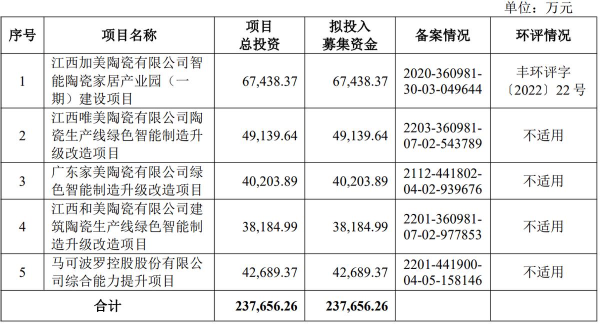 對比可知,馬可波羅刪掉了“廣東東唯新材料有限公司年產(chǎn)540萬平方米特種高性能陶瓷板材項(xiàng)目”,該項(xiàng)目原計(jì)劃投入7.81億元。而此次上市,馬可波羅最終的募資凈額約為15.6億元,較早前的40.18億元縮減約25億元,較調(diào)整后縮減約8億元。