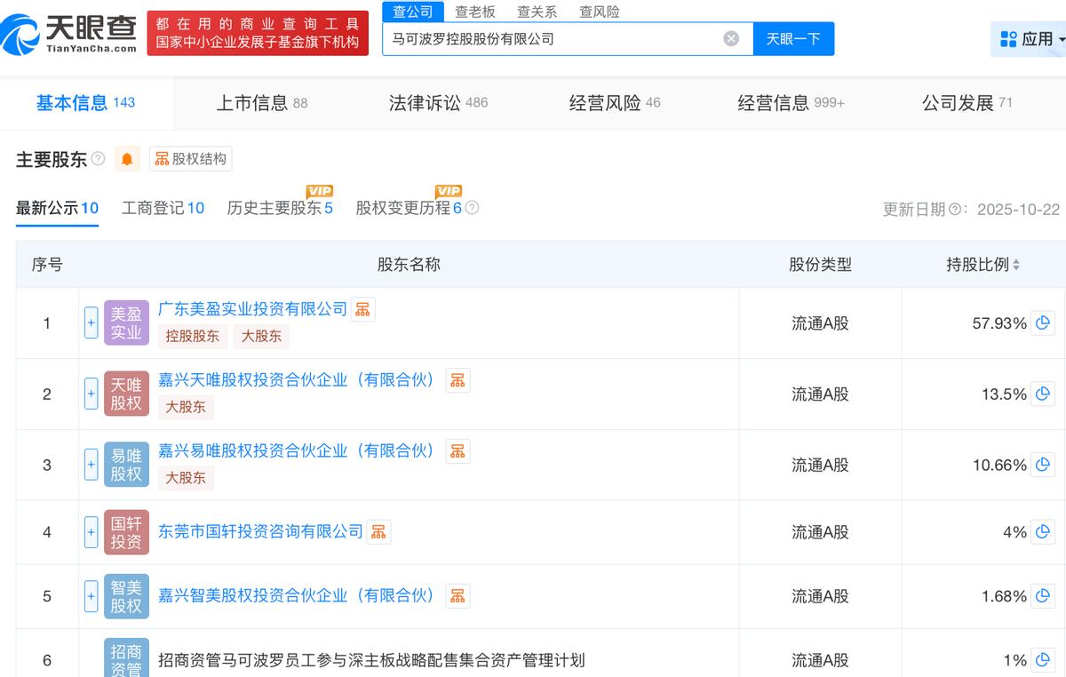 天眼查App信息顯示,馬可波羅成立于2008年11月,前稱為廣東馬可波羅陶瓷有限公司。目前,該公司的注冊資本約為10.75億元,法定代表人為黃建平,主要股東包括美盈實(shí)業(yè)、嘉興天唯、嘉興易唯等。