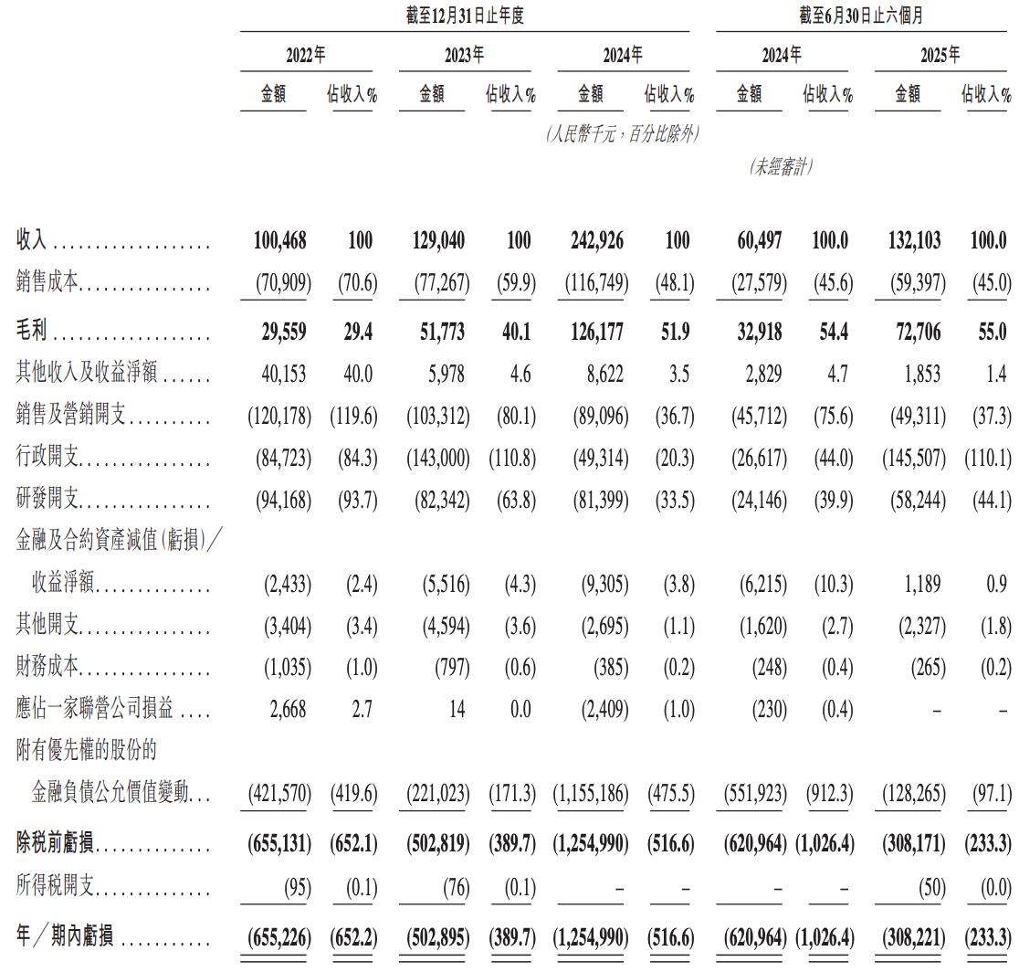 2022年、2023年、2024年度和2025年上半年,滴普科技的營收分別約為1.00億元、1.29億元、2.43億元和1.32億元,凈虧損分別約6.55億元、5.03億元、12.55億元和3.08億元。