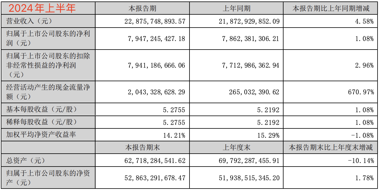 貝多財經了解到,洋河股份2024年上半年的收入約為228.76億元,同比增長4.58%,凈利潤和扣非后凈利潤分別為79.47億元和79.41億元,分別實現1.08%和2.96%的增長。即便維持了增長,但增速已然大幅放緩。