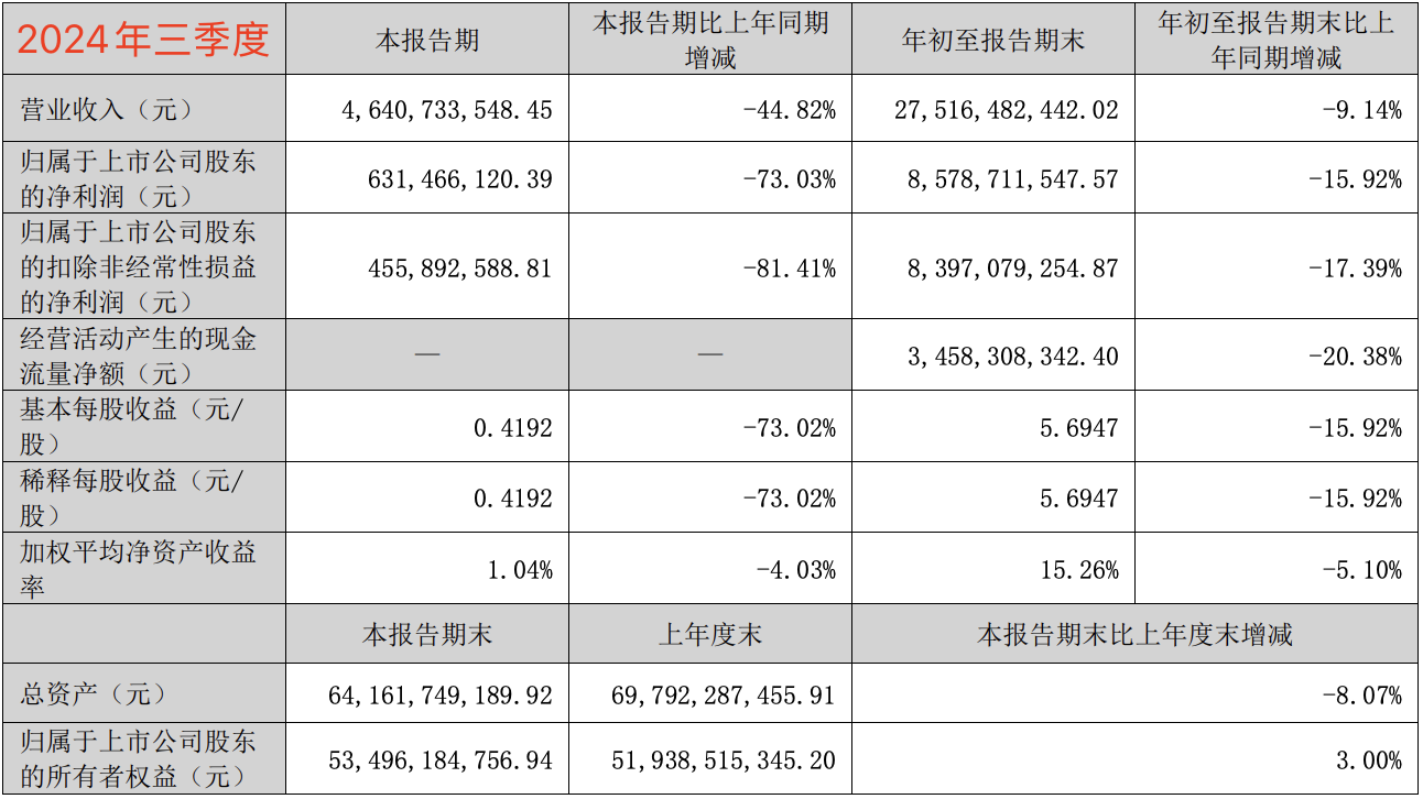 數據顯示,洋河股份2024年第三季度的收入約為46.41億元,較2023年同期的84.10億元下降44.82%,近乎“腰斬”;歸歸凈利潤約為6.31億元,同比驟降73.03%;扣非后凈利潤4.56億元,較2023年同期減少81.41%,已然“膝斬”。