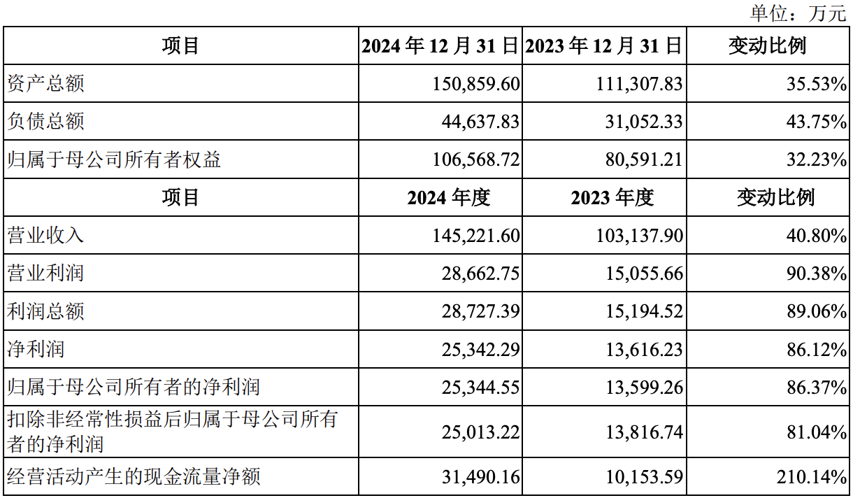據招股書披露,漢桑科技2024年度的收入約為14.52億元,同比增長40.80%;凈利潤約2.53億元,同比增長86.12%;扣非后凈利潤約2.50億元,同比增長81.04%。