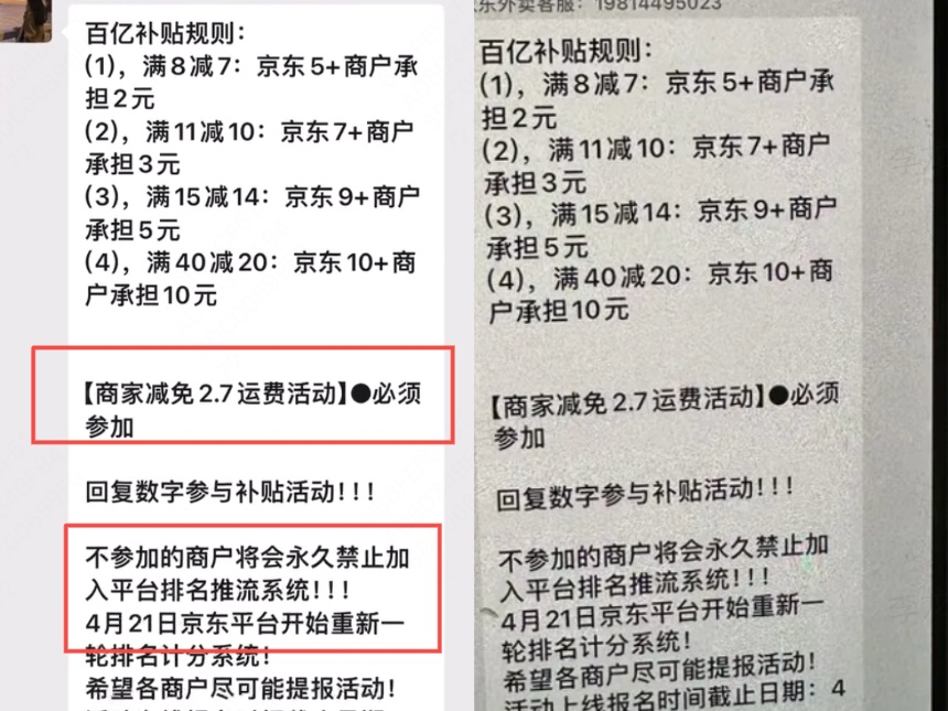 根據網傳截圖,除了需幫助平臺分攤活動補貼成本外,平臺還強制性要求商家參與“減免2.7運費”活動,并在通知中強調“4月21日京東平臺將開啟新一輪排名記分系統,不參與補貼的商戶將會永久禁止加入平臺排名推流系統”。