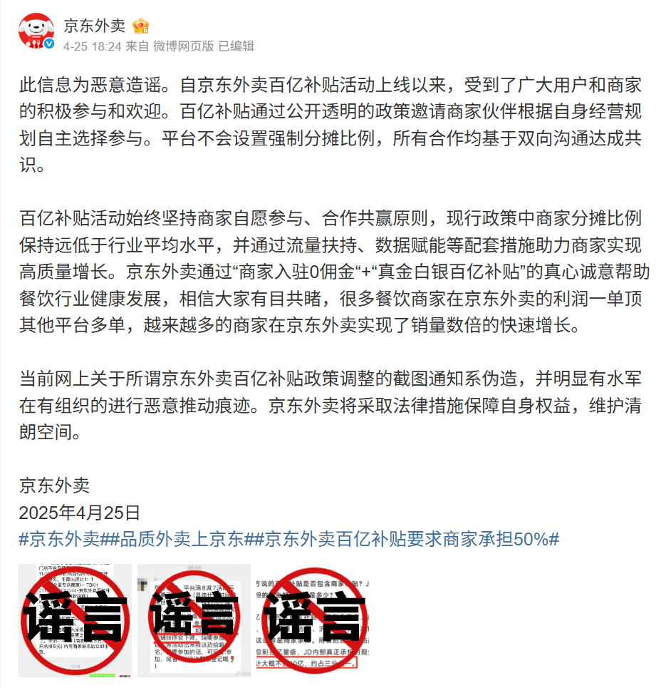 盡管京東外賣很快發文辟謠,強調百億補貼通過公開透明的政策邀請商家伙伴根據自身經營規劃自主選擇參與,平臺不會設置強制分攤比例,所有合作均基于雙向溝通達成共識,但就目前的商家反饋來看,此番回應能否取信于人仍有待商榷。
