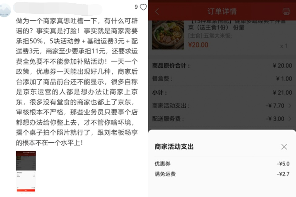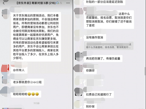 實際上,在這場“補貼風波”之前,業界有關京東外賣運營模式的爭議便久久不息。筆者通過社交平臺了解到,反映京東外賣平臺存在強制商家降價、參與營銷活動等情形的入駐商家,不在少數。