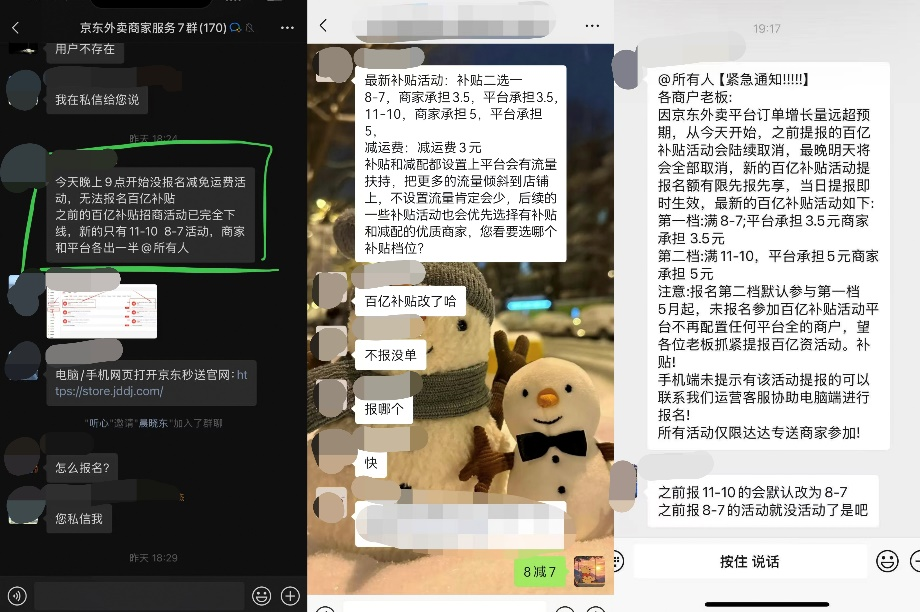 另據商家披露的聊天記錄,京東外賣官方發布辟謠內容后,相關商家運營商也統一了口徑,宣稱“不會強迫商家報名,所有的營銷活動都是讓利給到用戶,即便商家沒有參加,京東也不會做任何限流等相關限制”。