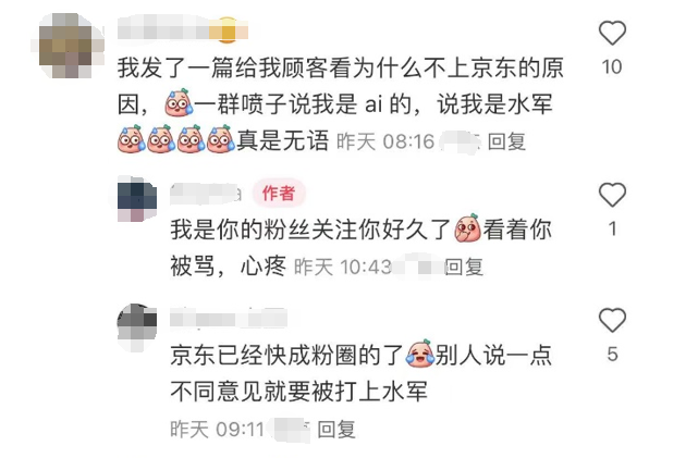 另有不少商家反映自己因發表不同意見被打為“水軍”“AI”,怒斥京東外賣“敢做不敢當”。在入駐商戶看來,京東外賣試圖運用公關逃避現存問題和平臺責任的動作本身,才是導致其口碑下滑、負面輿論纏身的根本原因。