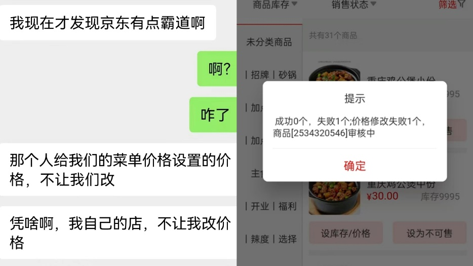 據悉,有商家在京東外賣“百億補貼”期間對一份原價25元的商品進行價格調整時,修改為26元提交失敗,嘗試輸入24元則保存成功;而當其想將價格恢復為25元時,卻再次顯示失敗,平臺疑似通過鎖價來限制商家提升商品價格。