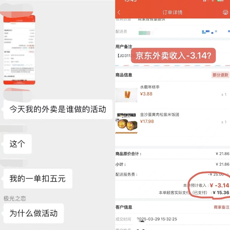 還有不少商家表示,自己在不知情的情況下被平臺強制參與了補貼活動,且無法找到下架優惠券、退出活動的路徑,甚至因此出現了顧客支付15.36元、商戶實際收入-3.14元的“負收入訂單”,門店經營效益無法得到保障。