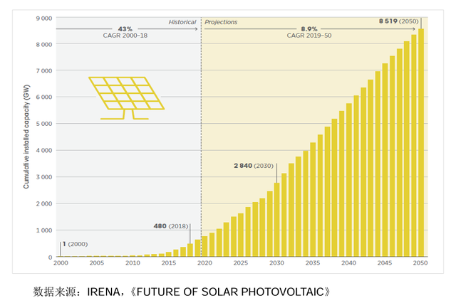 展望未來,在全球能源轉型與綠色發展的背景下,光伏產業或將迎來新一輪周期性增長。根據IRENA的預測,2030年度和2050年度的新增光伏裝機量將分別達到270GW和372GW,全球光伏累計裝機量將分別達到2840GW和8519GW。