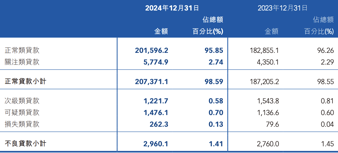 威海銀行在財報中表示,截至2024年末,該行的次級類貸款占比較2023年末下降0.23個百分點至0.58%,可疑類貸款占比較2023年末上升0.10個百分點至0.70%,損失類貸款占比較2023年末上升0.09個百分點至0.13%。
