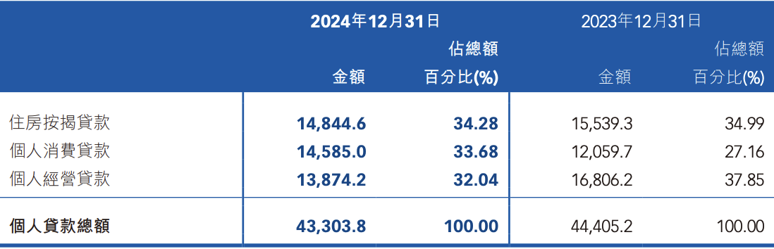 除了個人消費貸業務外,威海銀行的零售銀行業務還包括住房按揭貸款、個人經營貸款等。截至2024年末,該行的住房按揭貸款、個人經營貸款余額分別為148.45億元、138.74億元,分別同比減少4.47%、17.45%。